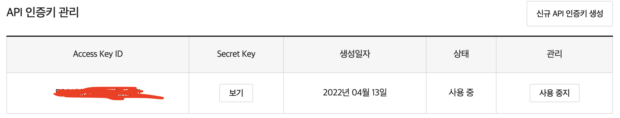 위와같이 설정하는데, ACCESS KEY와 SECRET KEY는 포털에서 확인 가능합니다.